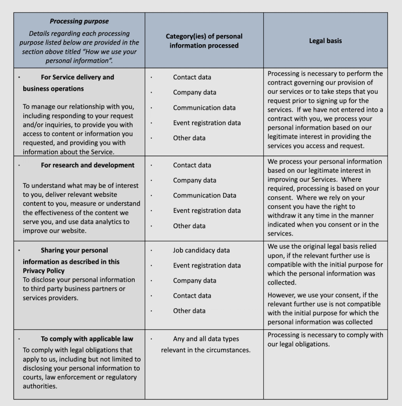 Legal bases for processing. We use your personal information only as permitted by law. The European data protection legislation requires us to ensure we have a “legal basis” for each purpose for which we collect your personal information. We rely on the following legal bases for processing the personal information described in this Privacy Policy, as described in the table below: