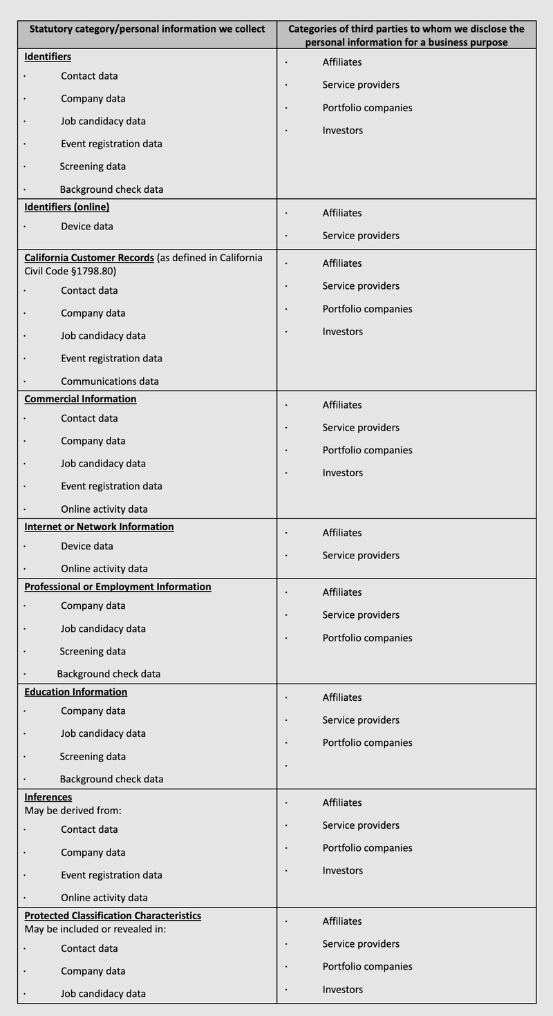 - Company data. Any information about you, your colleagues, or your company that you share with us in relation to investments or potential investments in your company by the funds we manage, such as your and colleagues’ professional and educational backgrounds.